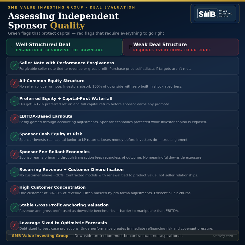 Good structure buys time. It creates flexibility. But if the underlying business is fundamentally fragile, even the best capital stack won’t preserve principal. Assessing independent sponsor quality in SMB deals always requires a hard look at what the business actually is, not what the model says it could become.