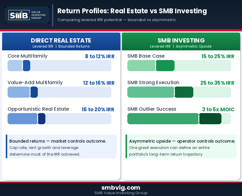 The difference in return profiles between real estate and SMB investing is not just a matter of degree. It is a matter of structure. Real estate returns, even in opportunistic strategies, tend to be capped. The market determines a significant portion of the outcome. SMB investing offers something structurally different: genuine asymmetry.